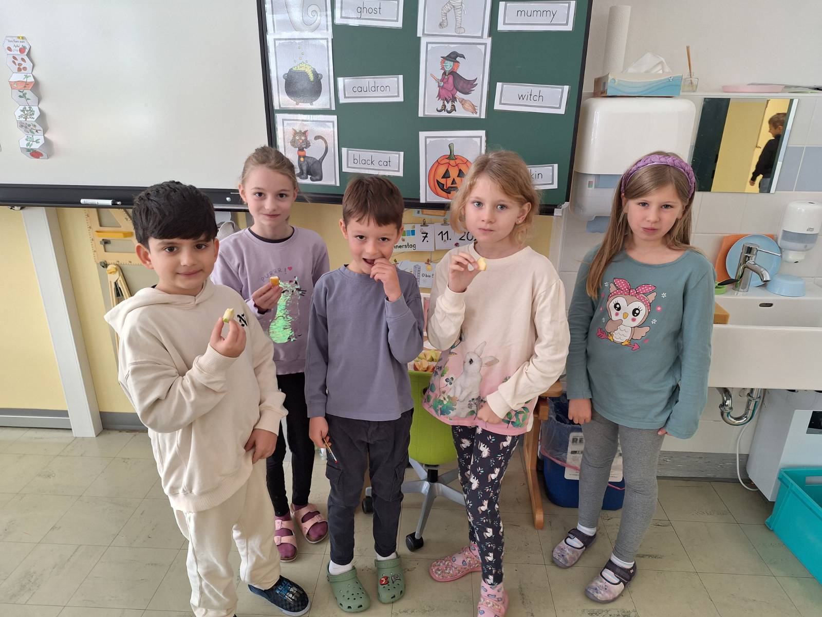 Die Kinder der Waschbärenklasse bereiteten vor den Herbstferien eine leckere Kürbissuppe zu. Zuerst machten sich die kleinen Köchinnen und Köche ans Werk und entkernten, schälten und schnitten die Kürbisse in kleine Stücke. Diese wurden dann in der Pfanne angebraten, bis sie eine goldene Farbe annahmen. Im nächsten Schritt gossen die Kinder die angebratenen Kürbisstücke mit einer feinen Suppe auf, die nach dem Aufkochen mit einem Pürierstab von der Lehrperson zu einer Suppe verarbeitet wurde. Um der Suppe den perfekten Geschmack zu verleihen, wurden noch verschiedene Gewürze hinzugefügt. Als kreativen Abschluss dekorierten die Kinder ihre eigenen Zierkürbisse für die bevorstehenden Ferien.