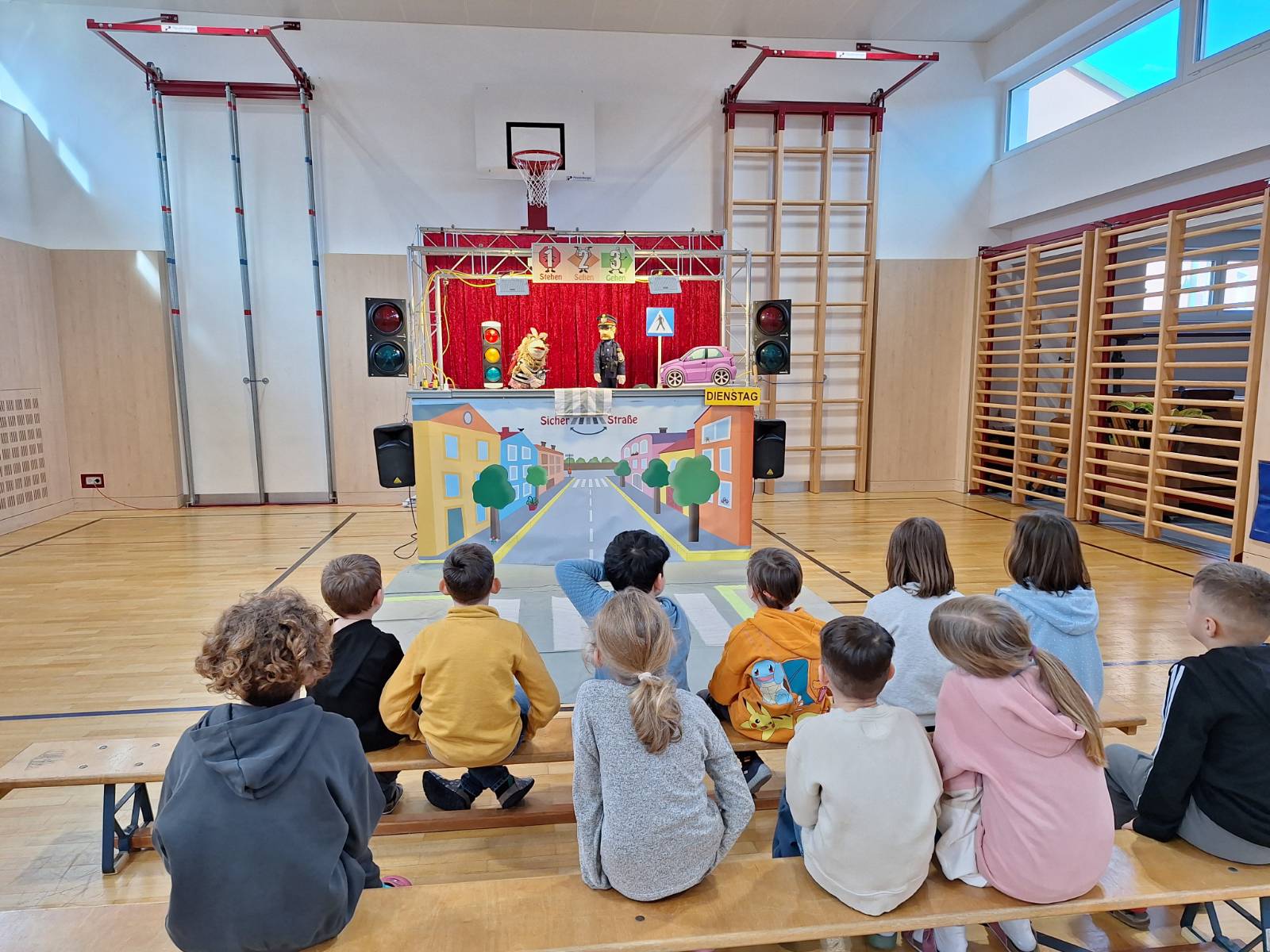 Ende Jänner durften die Schülerinnen und Schüler der 1. und 2. Klassen das interaktive Theaterstück "Sicher über die Straße" im Turnsaal der Volksschule Leopoldsdorf anschauen. Das Mitsingen und Mittanzen hat den Kindern besonders gut gefallen.